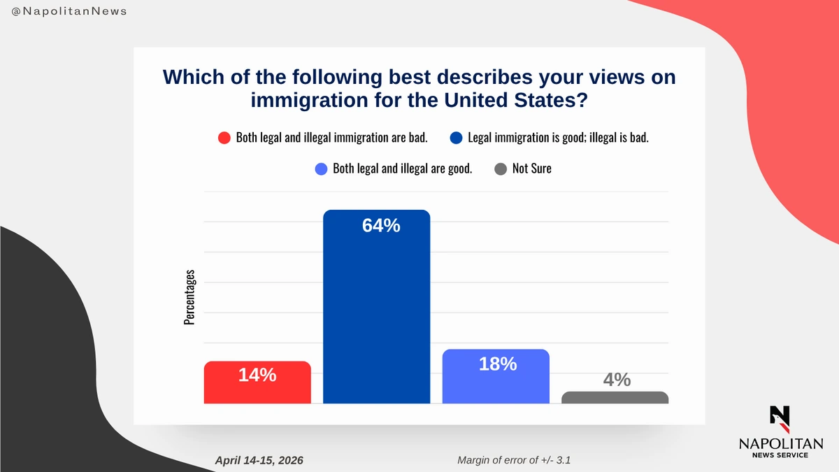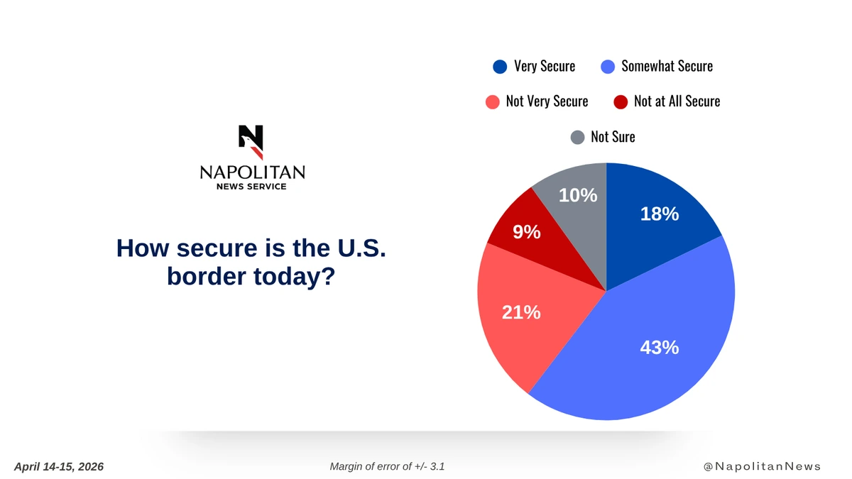 This data is from a Napolitan News Service survey of 1,000 Registered Voters conducted online by Scott Rasmussen, April 14-15, 2026. RMG Research, Inc., conducted the field work for the survey. It has a margin of error of +/- 3.1.