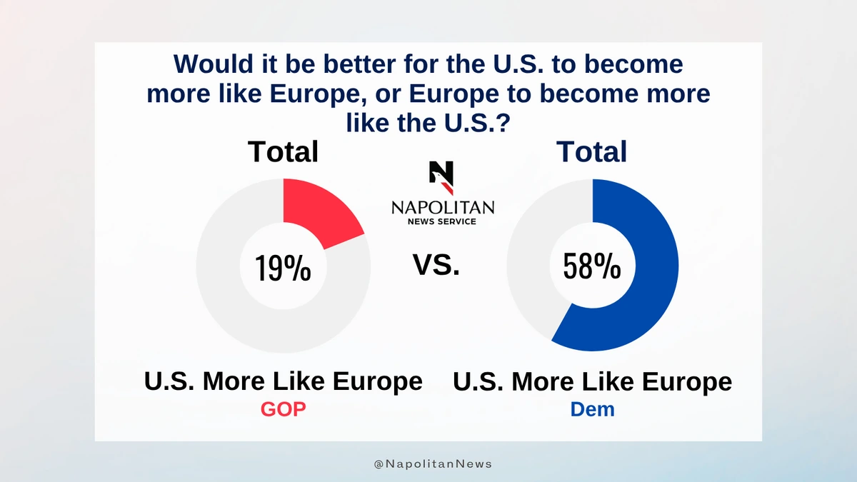 • In February of this year, the gap had closed, with 38% of voters claiming the U.S. should become more like Europe, while 40% said Europe should become more like the U.S.