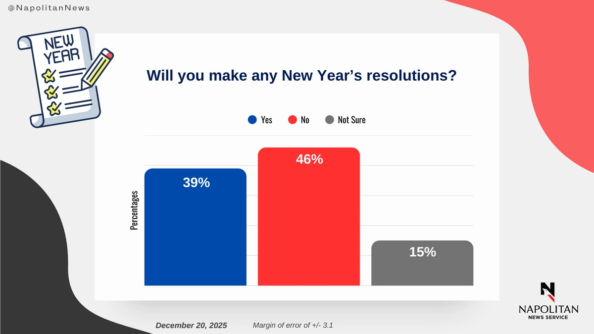 • Forty-six percent 46% of voters will not be making a New Year's Resolution come Dec. 31st this year.