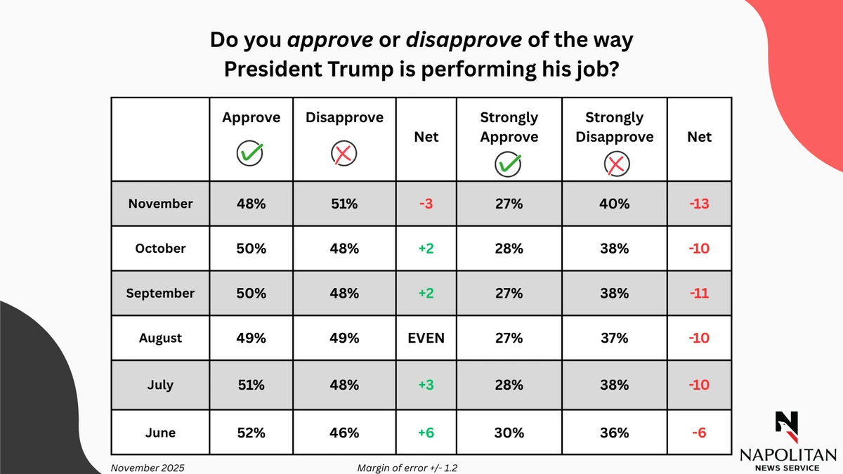 This data is from a Napolitan News Service survey of 6,186 Registered Voters conducted online by Scott Rasmussen for the full month of November 2025. RMG Research, Inc., conducted the field work for the survey. It has a margin of error of +/- 1.2.
