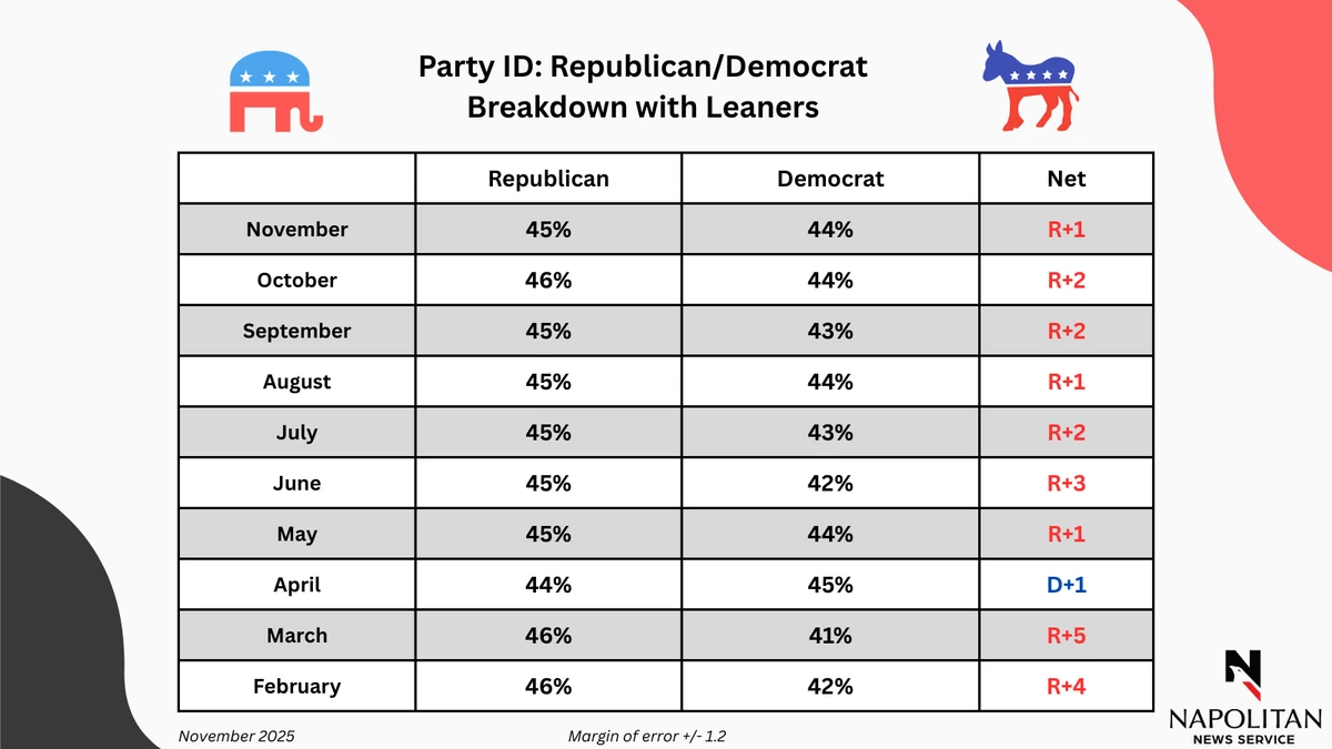 This data is from a Napolitan News Service survey of 6,186 Registered Voters conducted online by Scott Rasmussen for the full month of November 2025. RMG Research, Inc., conducted the field work for the survey. It has a margin of error of +/- 1.2.