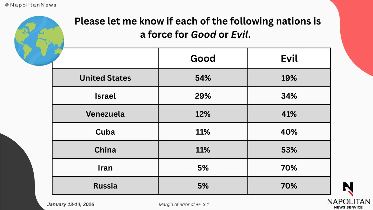 This data is from a Napolitan News Service survey of 1,000 Registered Voters conducted online by Scott Rasmussen, January 13-14, 2026. RMG Research, Inc., conducted the field work for the survey. It has a margin of error of +/- 3.1.