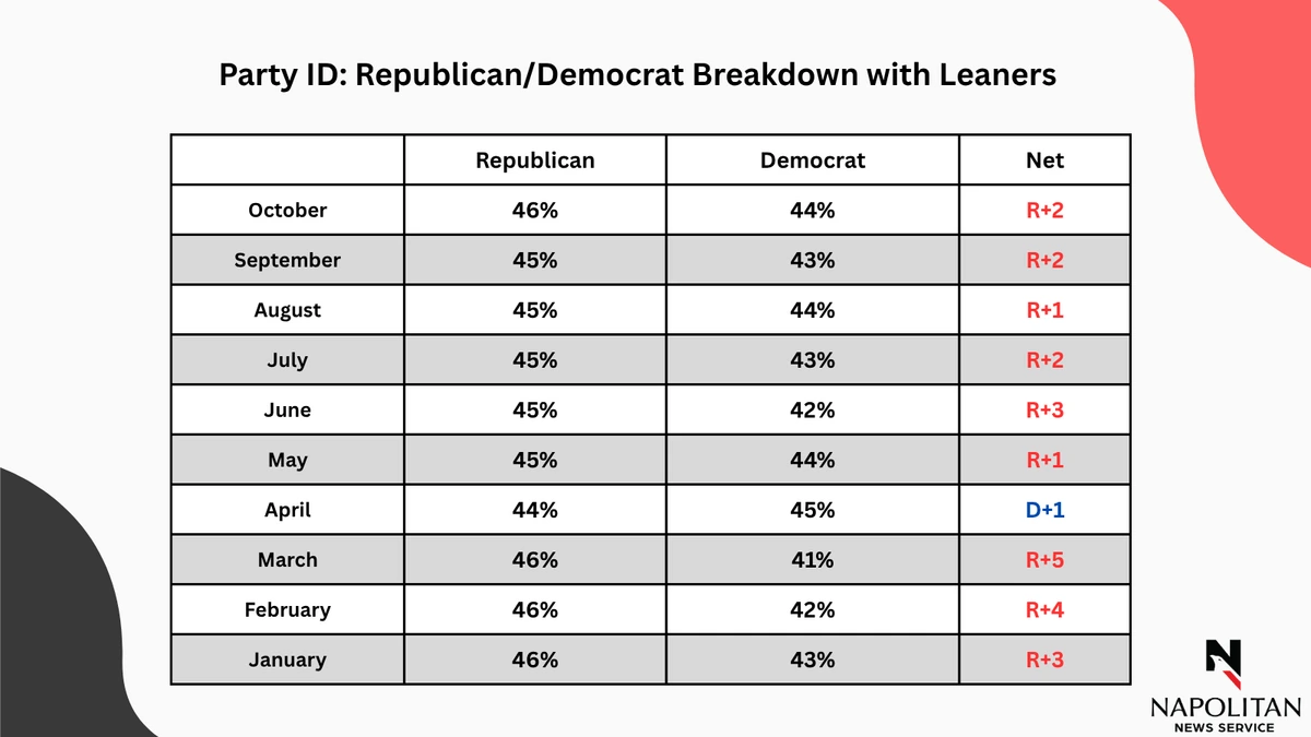 • Republicans have held a party edge every month from last November through September, except during the month of April, when tariffs were announced.