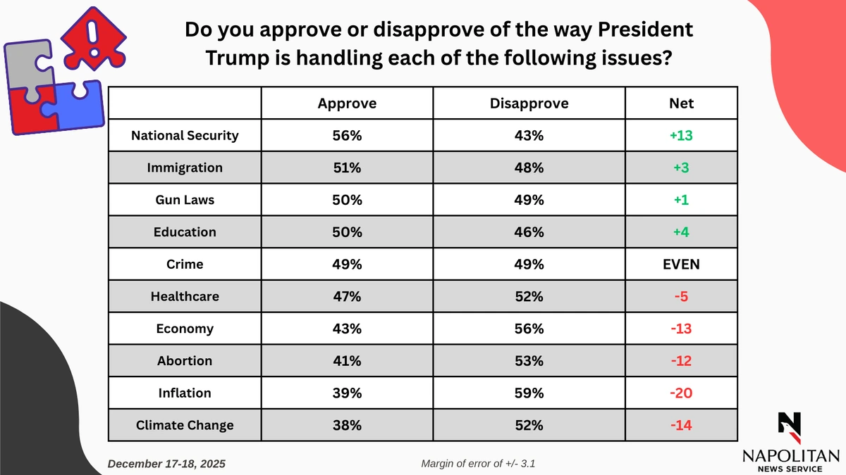 This data is from a Napolitan News Service survey of 1,000 Registered Voters conducted online by Scott Rasmussen, December 17-18, 2025. RMG Research, Inc., conducted the field work for the survey. It has a margin of error of +/- 3.1.