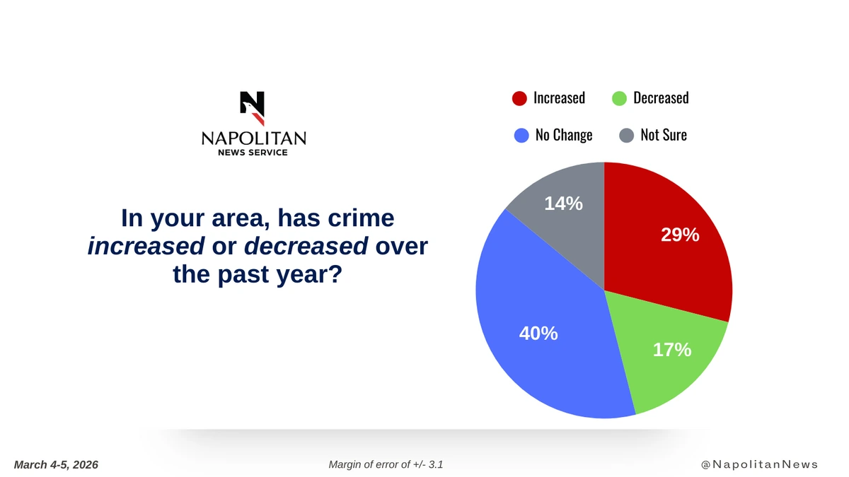 • Twenty-nine percent (29%) of registered voters say that crime has increased in their area in the last year.