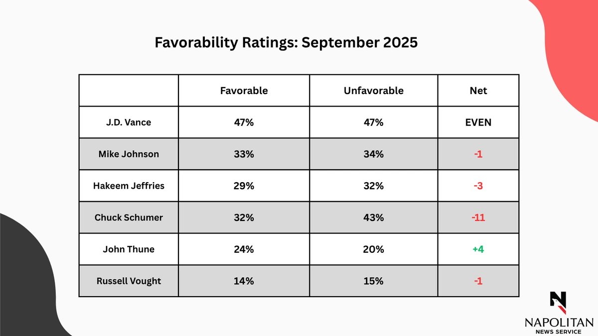 The most recent data cited is from a Napolitan News Service survey of 1,000 Registered Voters conducted online by Scott Rasmussen, October 1, 2025. Field work for the survey was conducted by RMG Research, Inc. and has a margin of error of +/- 3.1