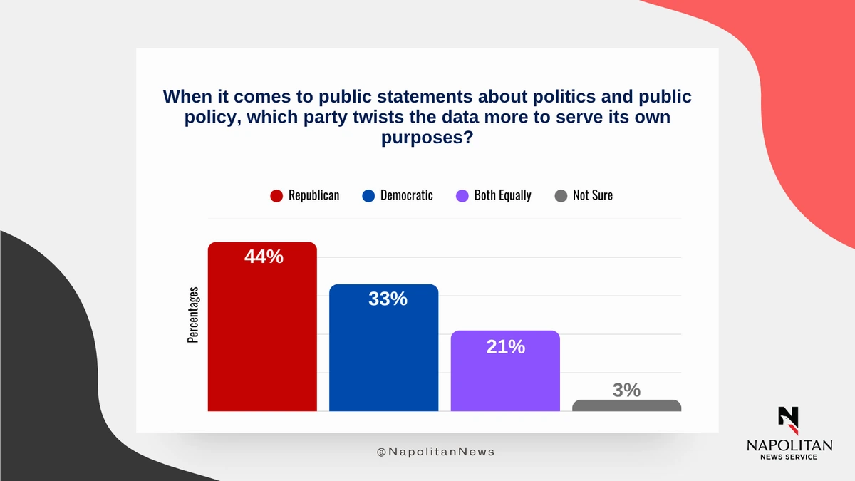 • When it comes to public statements about politics and public policy, a solid plurality (44%) of registered voters say the Republican party twists the data more to serve its own purposes.