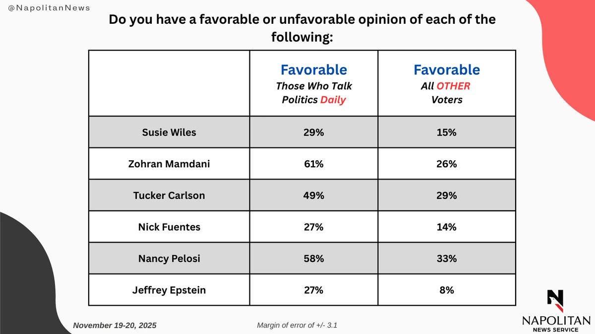 This data is from a Napolitan News Service survey of 1,000 Registered Voters conducted online by Scott Rasmussen, November 19-20, 2025. RMG Research, Inc., conducted the field work for the survey. It has a margin of error of +/- 3.1.