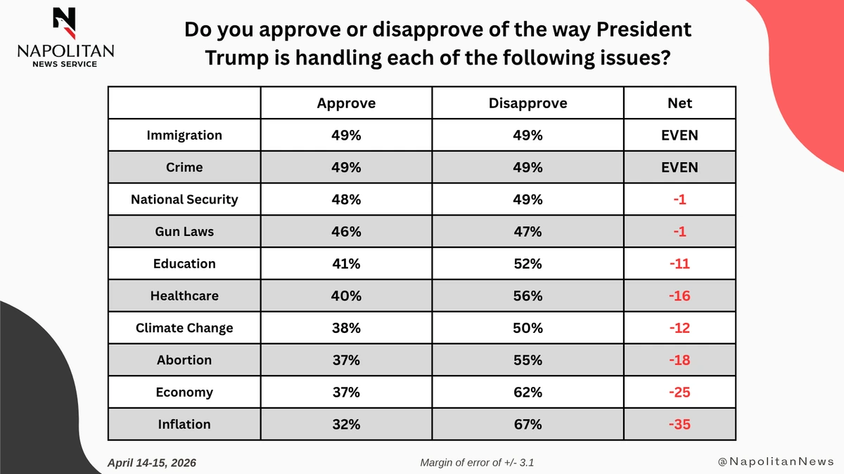 This data is from a Napolitan News Service survey of 1,000 Registered Voters conducted online by Scott Rasmussen, April 14-15, 2026. RMG Research, Inc., conducted the field work for the survey. It has a margin of error of +/- 3.1.