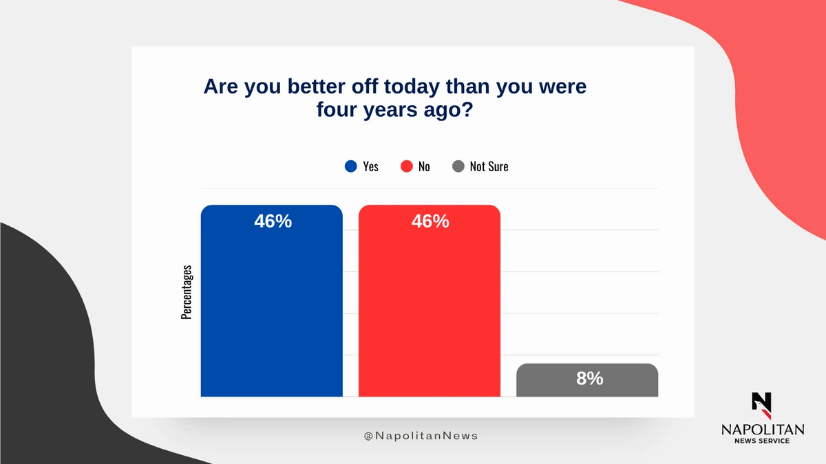 • Forty-six percent (46%) of voters claim they are better off than they were four years ago, while another 46% say they are not.