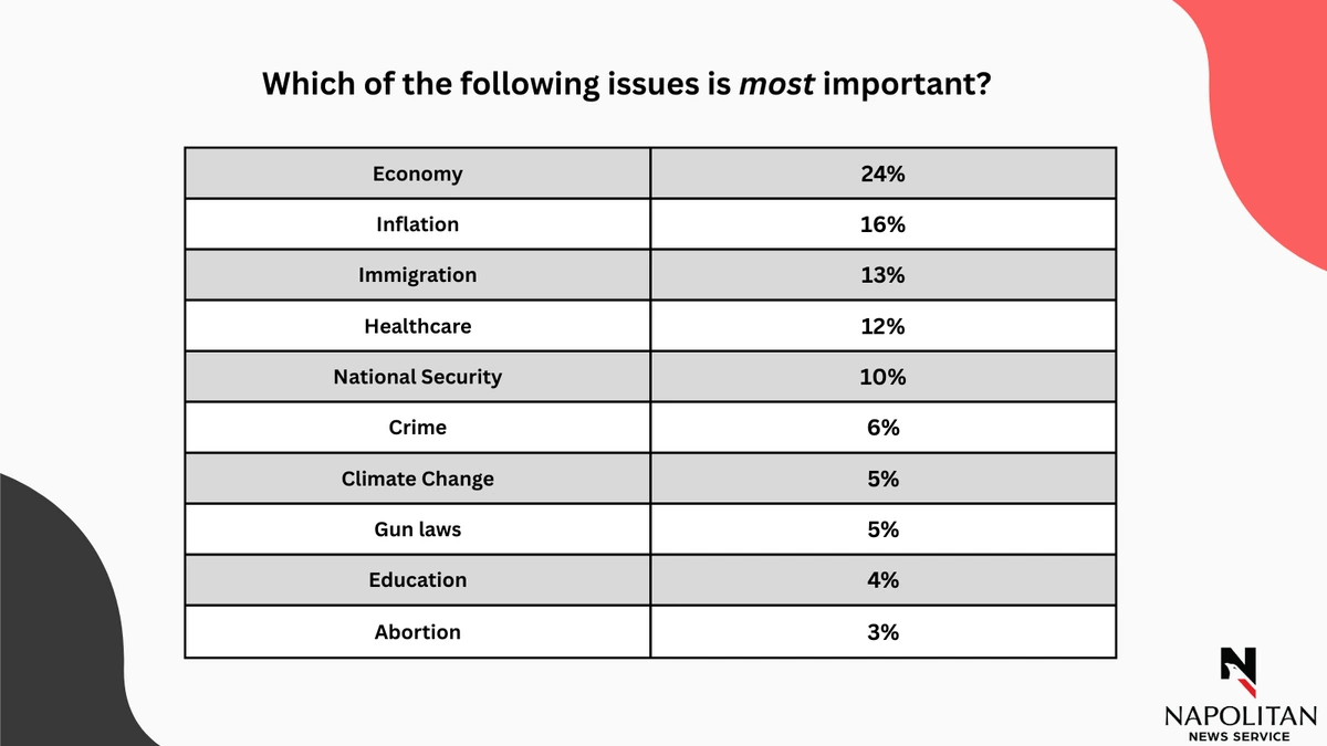 • Among 1,000 registered voters, Inflation (16%), Immigration (13%) and Healthcare (12%) also rank highly.