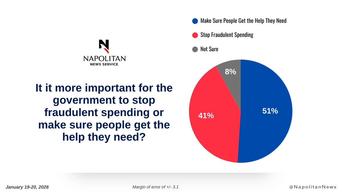 • Napolitan News asked voters which they considered to be the bigger problem: Too Much Fraudulent Spending, or Too Many People Not Getting the Help They Need--they were evenly divided.