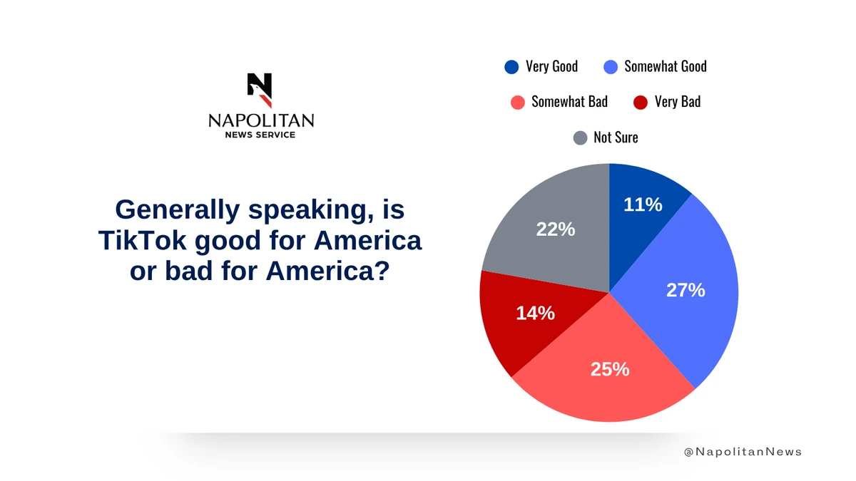 • Voters are evenly divided on whether TikTok is good or bad for America, with 38% saying good and 39% saying bad.
