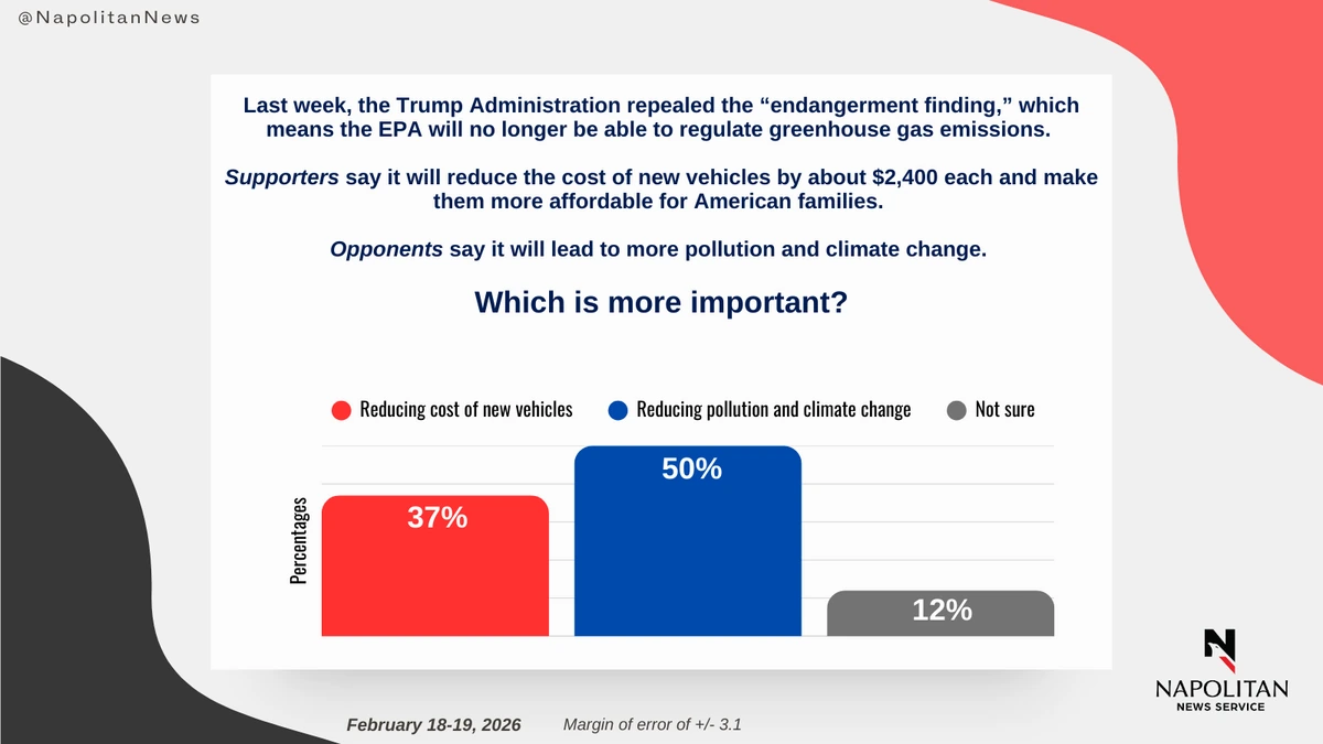 • In the wake of the Trump Administration's rollback of EPA regulations, 50% of registered voters say reducing pollution and climate changes is more important than reducing the cost of new vehicles.