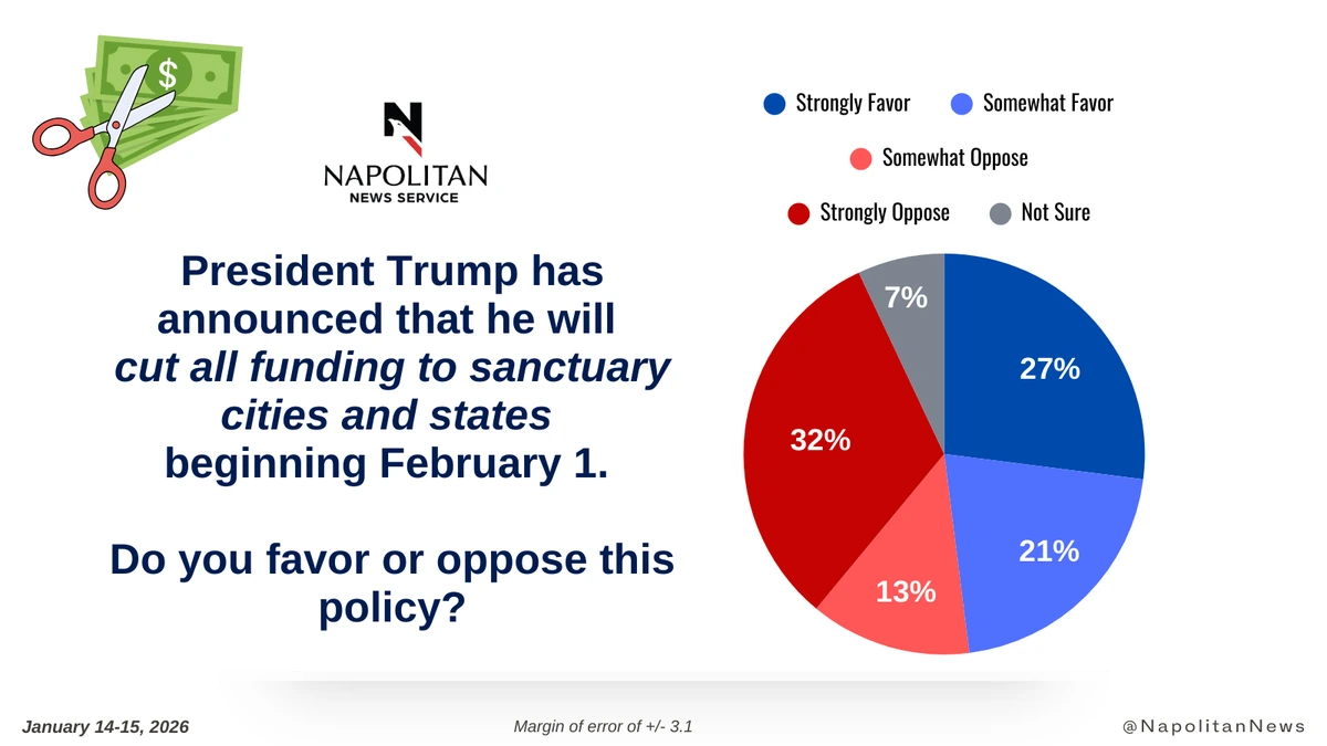 This data is from a Napolitan News Service survey of 1,000 Registered Voters conducted online by Scott Rasmussen, January 14-15, 2026. RMG Research, Inc., conducted the field work for the survey. It has a margin of error of +/- 3.1.