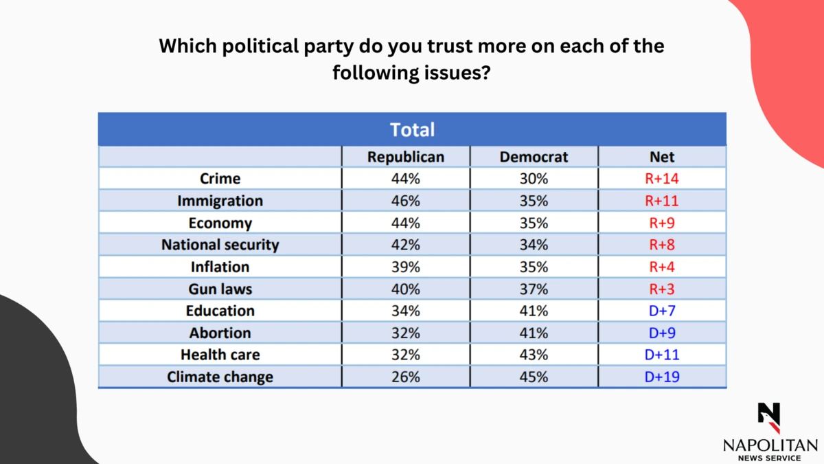 • On Immigration, 46% of voters trust Republicans versus 35% who trust Democrats.