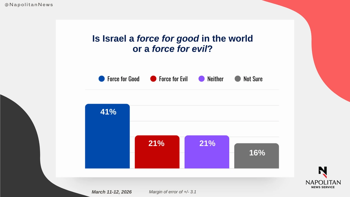 • Fewer voters (41%) say Israel is a force for good in the world.